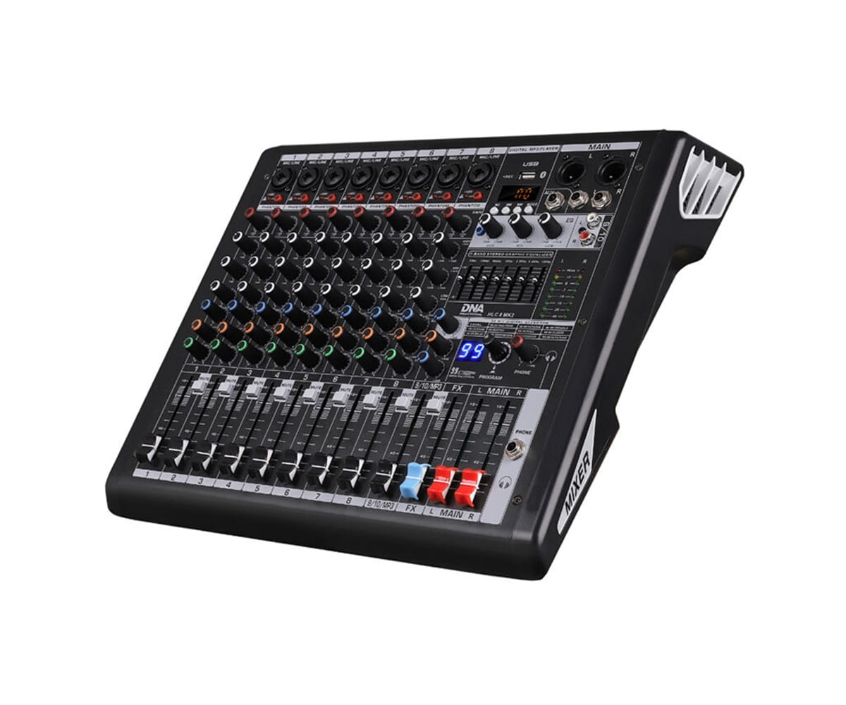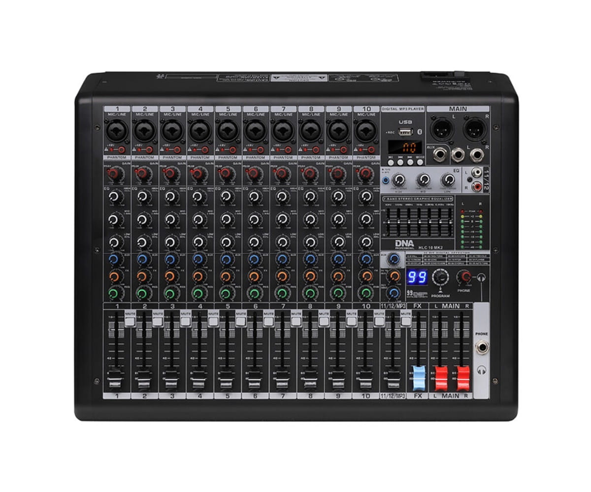 DNA HLC 10 MK2 to analogowy mikser audio, wyposażony w dziesięć kanałów wejściowych mono i jeden kanał wejściowy stereo, wysokiej klasy przedwzmacniacze, port USB z funkcjami MP3 i REC oraz standard bezprzewodowej komunikacji Bluetooth. Sprzęt doskonale sprawdza się jako mikser sceniczny podczas koncertów i występów estradowych, na salach prób, a także w domowym studio nagrań.