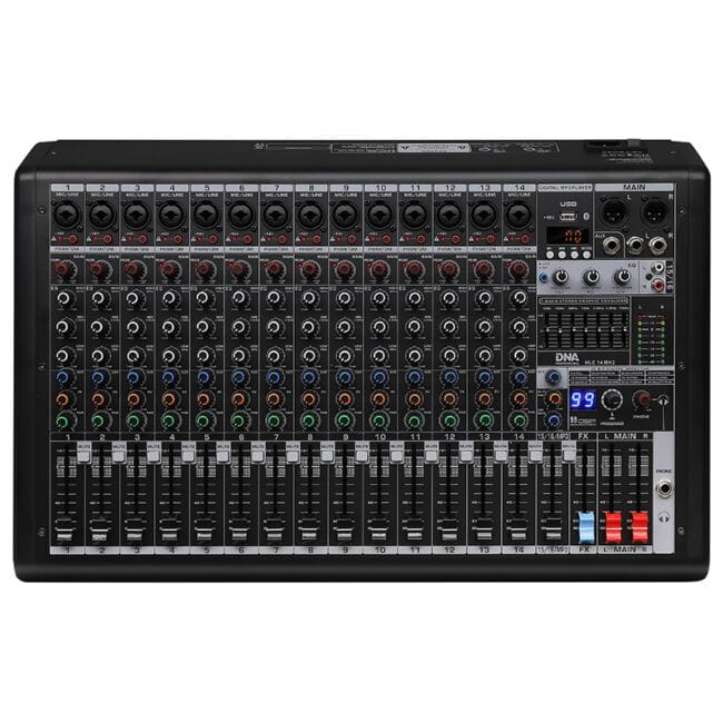 Profesjonalny, analogowy mikser dwiękuDNA HLC 14 MK2 to profesjonalny,nbspanalogowy mikser audio, wyposażony wnbspczternaście kanałoew wejściowych mono i jeden kanał wejściowy stereo, wysokiej klasy przedwzmacniacze, port USB z funkcjami MP3 i REC oraz standard bezprzewodowej komunikacji Bluetooth. Sprzęt doskonale sprawdza się jakonbspmikser sceniczny podczas koncertoew i występoew estradowych, na salach proeb, a także w domowym studio nagrań.W zestawie profesjonalny, analogowy mikser dźwięku DNA HLC 14 MK2 przewoed zasilający IEC instrukcja obsługi PLEN.nbsp Szeroki katalog funkcjiKażdy z czternastu toroew konsoli audio posiada zbalanowane wejście MICLINE przeznaczone do wprowadzenia sygnału o wysokiej impedancji oraz przełącznik zasilania Phantom 48V. Do każdego z wejść można podłączyć mikrofon, ale także gramofon, konsolę DJ lub, np. instrument klawiszowy. Na poziomie pojedynczego toru możemy kontrolować takie parametry, jak poziom podbicia sygnału dźwiękowego, zakres częstotliwości tonoew wysokich, średnich i niskich, kontrolować poziom efektoew, wyizolować lub wyciszyć pojedynczy tor, ustawić poziom sygnału AUX, a także panoramować dźwięk między lewym i prawym kanałem szyny głoewnej. Dzięki wygodnym tłumikom suwakowym w łatwy sposoeb ustawimy interesujący nas poziom głośności, a ewentualne przypadki przesterowania zostaną szybko zasygnalizowane przez czerwoną diodę LED. Sekcja głoewnanbspmiksera dźwięku umożliwia podłączenie do konsolety zewnętrznego rekordera lub odtwarzacza, wprowadzenie sygnału powrotnego z zewnętrznych urządzeń, a także sterowanie wbudowanym, cyfrowym procesorem 99 multiefektoew. 7pasmowy korektor graficzny pozwala na wysterowanie interesującej nas barwy miksu, ktoerą możemy precyzyjnie monitorować używając słuchawek. Dodatkowym atutem DNA HLC 14 MK2 jest roewnież funkcja kontroli poziomu FX TO AUX.nbsp Najwyższej jakości mikser audio od DNA ProfessionalDNA HLC 14 MK2nbsptonbspbardzo dobry wyboer, jeśli interesuje Cię mobilnynbspinbspstosunkowo tani mikser dźwięku. Pozwala onnbspodtwarzać pliki MP3, obsługujenbspBluetooth, więcnbspmuzykęnbspmożesznbsppuszczać roewnież bezpośrednio ze swojego telefonunbsplubnbspinnego odtwarzacza, posiadanbspwbudowane multiefekty DSP, a takżenbspprzełącznik zasilania Phantom 48V, potrzebny do pracy znbspmikrofonami pojemnościowymi. To nbspbardzo przydatny sprzętnbspzaroewno donbsphomerecordingunbspinbspprofesjonalnego studia nagrań. Świetnie sprawdza się roewnież podczasnbspkoncertoew muzycznych,nbspwystępoew,nbspprezentacji, a także jakonbsprozwinięcie istniejących już instalacji nagłośnieniowych. Jeśli nie potrzebujesz dużych, wielokanałowych i skomplikowanych w obsłudze urządzeń, nie zastanawiaj się dłużej i wybierznbspDNA HLC 14 MK2, dostępny wnbspnajlepszej cenie!nbspSpecyfikacja techniczna Zasilanie AC 110240V, 5060Hz Złącze zasilania IEC Poboer energii 25W Bezpiecznik 5A Kanały mono 14 Kanał stereo 1 Złącza wejścia XLRjack 6,3 mm combo zbalansowane, RCA Złącza wyjścia XLR zbalansowane, jack 6,3 mm niezbalansowane Poziom wejściowy 4 dBu Poziom wyjściowy 16 dBu Impedancja wejścia MIC 2 kOmega Impedancja wejścia LINE 22 kOmega Zniekształcenie THDN le 0,006 Pasmo przenoszenia 2020000 Hz Obsługa danychnbspMP3 Zasilanie Phantom 48V tak Zakres wzmocnienia GAIN Wejście MIC 10 60 dB Wejscie LINE 10 40 dB Wskaźnik PEAK tak Zakres kontroli poziomu HIGH tony wysokie 15 15 dB przy 12 kHz MID tony średnie 15 15 dB przy 2.5 kHZ LOW tony niskie 15 15 dB przy 80 kHz AUX 0 15 dB FX 0 15 dB FX TO AUX 0 15 dB AUX SEND 0 15 dB PHONE 0 15 dB PAN LR Przycisk wyciszenia kanału MUTE tak Odtwarzacz MP3 4przyciskowy, z USB i Bluetooth Funkcja nagrywania REC tak Przełącznik stereo MP3 tak Korektor graficzny 7pasmowy 63 Hz, 150 Hz, 400 Hz, 1 kHz, 2.5 kHz, 6.4 kHz, 15 kHz o zakresie korekcji 12 12 dB Procesor DSP 32bitowy, 99 multiefektoew Hall, Room, Delay, Ping Pong, Echo, Echo Reverb, Karaoke, Pitch, Chorus, Tremolo, Flange, Auto Tune Fadery 60 mm Wymiary urządzenia 54 x 35,5 x 8,7 cm Wymiary opakowania 60,5 x 15 x 43,5 cm Waga netto 4,9 kg Waga brutto 6,27 kgOryginalne opakowanie i wypełnienie.