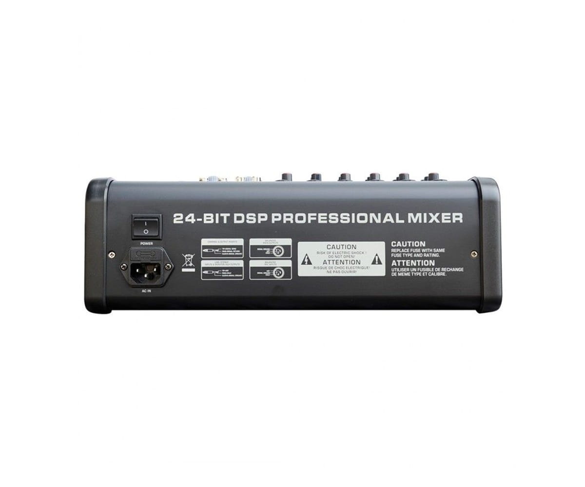Każdy z sześciu torów konsoli audio posiada niezbalanowane wejście LINE IN/MIC przeznaczone do wprowadzenia sygnału o wysokiej impedancji. Może to być mikrofon, ale także gramofon, konsola DJ lub np. instrument klawiszowy. Na poziomie pojedynczego toru możemy kontrolować takie parametry, jak poziom podbicia sygnału dźwiękowego, zakres częstotliwości tonów wysokich, średnich i niskich, dodawać efekty, wyizolować lub wyciszyć pojedynczy tor, a także panoramować dźwięk między lewym i prawym kanałem szyny głównej. Dzięki wygodnym tłumikom suwakowym w łatwy sposób ustawimy interesujący nas poziom głośności, a ewentualne przypadki przesterowania zostaną szybko zasygnalizowane przez czerwoną diodę LED.