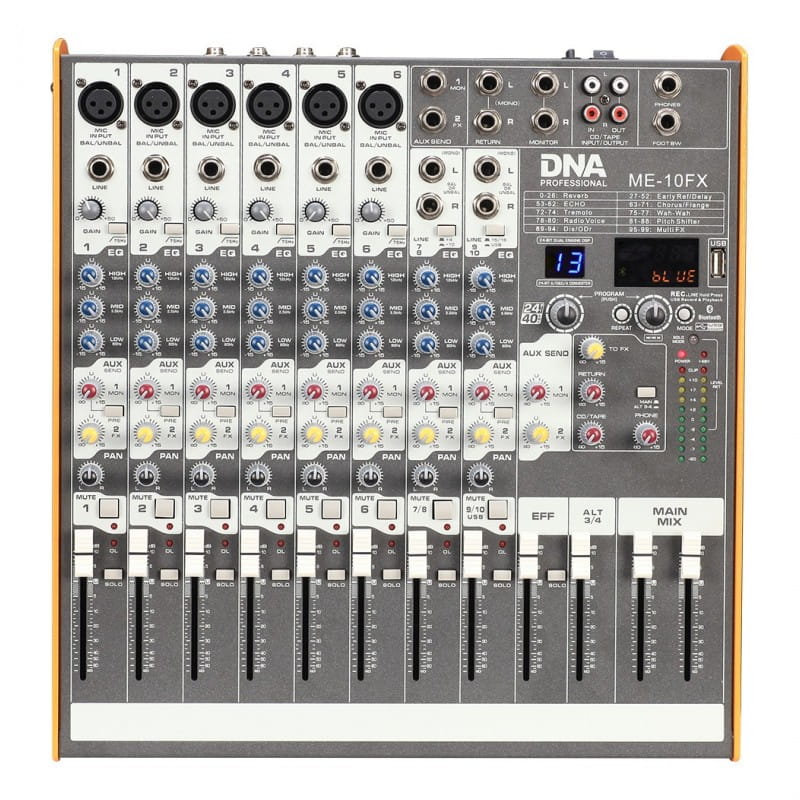 DNA ME10FX to profesjonalny, analogowy, 10kanaowy mikser audio z serii ME od DNA. Urządzenie wyposażone zostało w 6 wejść mono MICLINE oraz 2 wejścia stereo umożliwiające podłączenie do miksera np. klawiszy, perkusji elektronicznej, a także innego sprzętu muzycznego. Ponadto konsola posiada gniazda AUX Send, Return, wyjścia jack dla monitorów i słuchawek, a także gniazdo footswitch, dzięki któremu mamy możliwość włączania lub wyłączania efektów miksera za pomocą zewnętrznego przełącznika. W tej sekcji znajdują się również gniazda cinch, które dodatkowo rozszerzają możliwości konsolety.Na osi pojedynczego kanału możemy kontrolować siłę podbicia sygnału GAIN, jego equalizację na poziomie tonów wysokich, średnich i niskich, sterować kanałami AUX oraz FX, panoramować dźwięk, a także kontrolować jego głośność. Każdy tor wyposażony został w filtr górnoprzepustowy HPF obcinający częstotliwość do poziomu 80 Hz, przełącznik PRE dla wysyłki sygnału do szyn AUX, możliwość wyciszenia dźwięku za pomocą przełącznika MUTE lub aktywację wybranego kanału za pomocą przycisku SOLO.Sekcja główna ME10FX umożliwia ogólną kontrolę głośności wszystkich kanałów, kontrolę poziomu sygnału jednego z 99 wbudowanych efektów, takich jak reverb, delay czy chorus, a także ustawienie głośności dla torów AUX, CDTAPE i słuchawek. Mikser posiada również wbudowany port USB z procesorem kompatybilnym z formatem MP3 i WMA, a bezprzewodowy przesył danych zapewnia obsługa technologii Bluetooth.Na tylnym panelu obudowy znajdują się gniazda wyjściowe ALT 34, służące do podłączenia drugiego miksera lub alternatywnego systemu nagłośnieniowego, wyjścia główne MAIN OUT do podłączenia głównego źródła dźwięku, gniazdo i przełącznik zasilania oraz przełącznik Phantom 48V. Dzięki niemu konsola jest w stanie zasilić zewnętrzne urządzenia i instrumenty pasywne.DNA to marka, która łączy w sobie wysoką jakość sprzętu oraz bezkonkurencyjne ceny. Model ME10FX nie jest wyjątkiem. To wysokiej klasy mikser audio, oferujący szerokie możliwości kontrolowania sygnałów. Dzięki niewielkim rozmiarom i stosunkowo małej wadze urządzenie jest bardzo mobilne. Cenią je sobie realizatorzy dźwięku, zespoły muzyczne, firmy eventowe oraz DJe. Świetnie sprawdza się w studiach nagrań, w salach prób oraz podczas koncertów live, dlatego zastanawiając się, jaki mikser audio wybrać, warto zwrócić uwagę na tę pozycję w naszym sklepie! Specyfikacja technicznaPasmo przenoszenia 0,1dB 10Hz150KHzTHD 4dBu EIN 129dBuCMRR 1KHz 60dBCrosstalk 1KHz90dBPoziom wejściowy 0dB50dBZasilanie Phantom 48VDCHiFrequency 15dB12KHzMidFrequency 15dB2.5KHzLowFrequency 15dB80HzSzacunkowy poziom wyjściowyMainAUXMonitor 4dBuMaks. moc wyjścia 22dBuMaksymalny poziom wejściowyMic Input 12dBuLine Input 30dBuTape InputAUX Return 22dBuBezprzewodowa komunikacja Bluetooth takWymiary miksera 35 x 37 x 9,5 cmWymiary opakowania 43 x 42,5 x 17,5 cmWaga miksera 4,4 kgWaga brutto 5,4 kg