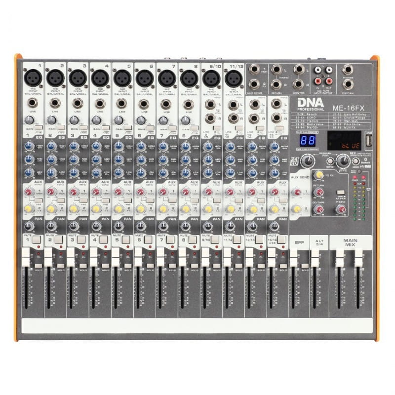 DNA ME16FX to profesjonalny, analogowy, 16kanaowy mikser audio z serii ME od DNA. Urządzenie wyposażone zostało w 8 wejść mono MICLINE oraz 4 wejścia stereo umożliwiające podłączenie do miksera np. klawiszy, perkusji elektronicznej, a także innego sprzętu muzycznego. Ponadto konsola posiada gniazda AUX Send, Return, wyjścia jack dla monitorów i słuchawek, a także gniazdo footswitch, dzięki któremu mamy możliwość włączania lub wyłączania efektów miksera za pomocą zewnętrznego przełącznika. W tej sekcji znajdują się również gniazda cinch, które dodatkowo rozszerzają możliwości konsolety.Na osi pojedynczego kanału możemy kontrolować siłę podbicia sygnału GAIN, jego equalizację na poziomie tonów wysokich, średnich i niskich, sterować kanałami AUX oraz FX, panoramować dźwięk, a także kontrolować jego głośność. Każdy tor wyposażony został w filtr górnoprzepustowy HPF obcinający częstotliwość do poziomu 80 Hz, przełącznik PRE dla wysyłki sygnału do szyn AUX, możliwość wyciszenia dźwięku za pomocą przełącznika MUTE lub aktywację wybranego kanału za pomocą przycisku SOLO.Sekcja główna ME16FX umożliwia ogólną kontrolę głośności wszystkich kanałów, kontrolę poziomu sygnału jednego z 99 wbudowanych efektów, takich jak reverb, delay czy chorus, a także ustawienie głośności dla torów AUX, CDTAPE i słuchawek. Mikser posiada również wbudowany port USB z procesorem kompatybilnym z formatem MP3 i WMA, a bezprzewodowy przesył danych zapewnia obsługa technologii Bluetooth.Na tylnym panelu obudowy znajdują się gniazda wyjściowe ALT 34, służące do podłączenia drugiego miksera lub alternatywnego systemu nagłośnieniowego, wyjścia główne MAIN OUT do podłączenia głównego źródła dźwięku, gniazdo i przełącznik zasilania oraz przełącznik Phantom 48V. Dzięki niemu konsola jest w stanie zasilić zewnętrzne urządzenia i instrumenty pasywne.DNA to marka, która łączy w sobie wysoką jakość sprzętu oraz bezkonkurencyjne ceny. Model ME16FX nie jest wyjątkiem. To wysokiej klasy mikser audio, oferujący szerokie możliwości kontrolowania sygnałów. Dzięki niewielkim rozmiarom i stosunkowo małej wadze urządzenie jest bardzo mobilne. Cenią je sobie realizatorzy dźwięku, zespoły muzyczne, firmy eventowe oraz DJe. Świetnie sprawdza się w studiach nagrań, w salach prób oraz podczas koncertów live, dlatego zastanawiając się, jaki mikser audio wybrać, warto zwrócić uwagę na tę pozycję w naszym sklepie! Specyfikacja technicznaZasilanie AC 100240V, 5060HzZużycie energii 25WBezpiecznik T1.6AL AC250VPasmo przenoszenia 0,1dB 10Hz150KHzTHD 4dBu EIN 129dBuCMRR 1KHz 60dBCrosstalk 1KHz90dBPoziom wejściowy 0dB50dBZasilanie Phantom 48VDCHiFrequency 15dB12KHzMidFrequency 15dB2.5KHzLowFrequency 15dB80HzSzacunkowy poziom wyjściowyMainAUXMonitor 4dBuMaks. moc wyjścia 22dBuMaksymalny poziom wejściowyMic Input 12dBuLine Input 30dBuTape InputAUX Return 22dBuBezprzewodowa komunikacja Bluetooth takWymiary miksera 46 x 37 x 10 cmWymiary opakowania 52 x 43 x 18 cmWaga netto 5,6 kgWaga brutto 6,7 kg