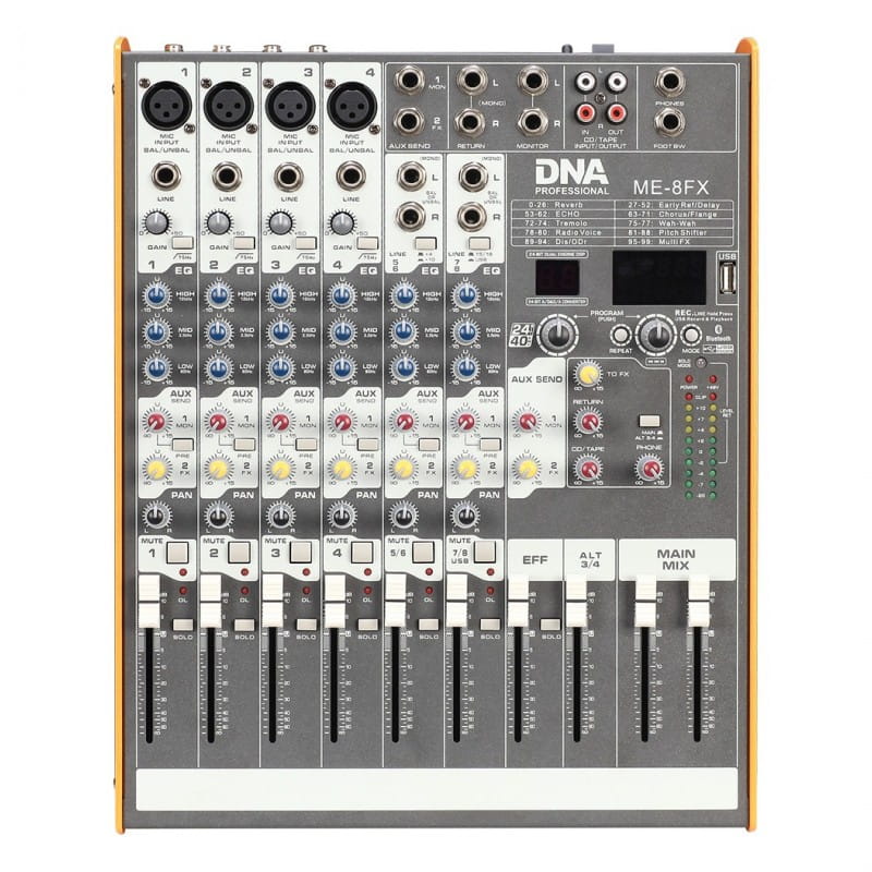 DNA ME8FX to profesjonalny, analogowy, 8kanaowy mikser audio znbspserii ME od DNA. Urządzenie wyposażone zostało wnbsp4 wejścia mono MICLINE oraz 2nbspwejścia stereo umożliwiające podłączenie do miksera np. klawiszy, perkusji elektronicznej, anbsptakżenbspinnego sprzętu muzycznego. Ponadto konsola posiada gniazda AUX Send, Return, wyjścia jack dla monitoroew inbspsłuchawek, anbsptakże gniazdo footswitch, dzięki ktoeremu mamy możliwość włączania lub wyłączania efektoew miksera za pomocą zewnętrznego przełącznika. Wnbsptej sekcji znajdują się roewnież gniazda cinch, ktoere dodatkowo rozszerzają możliwości konsolety.Na osi pojedynczego kanału możemy kontrolować siłę podbicia sygnału GAIN, jego equalizację na poziomie tonoew wysokich, średnich inbspniskich, sterować kanałami AUX oraz FX, panoramować dźwięk, anbsptakże kontrolować jego głośność. Każdy tor wyposażony został wnbspfiltr goernoprzepustowy HPF obcinający częstotliwość do poziomu 80 Hz, przełącznik PRE dla wysyłki sygnału do szyn AUX, możliwość wyciszenia dźwięku za pomocą przełącznika MUTE lub aktywację wybranego kanału za pomocą przycisku SOLO.Sekcja głoewna ME8FX umożliwia ogoelną kontrolę głośności wszystkich kanałoew, kontrolę poziomu sygnału jednego znbsp99 wbudowanych efektoew, takich jak reverb, delay czy chorus, anbsptakże ustawienie głośności dla toroew AUX, CDTAPE inbspsłuchawek. Mikser posiada roewnież wbudowany port USB znbspprocesorem kompatybilnym znbspformatem MP3 i WMA, anbspbezprzewodowy przesył danych zapewnia obsługa technologii Bluetooth.Na tylnym panelu obudowy znajdują się gniazda wyjściowe ALT 34, służące do podłączenia drugiego miksera lub alternatywnego systemu nagłośnieniowego, wyjścia głoewne MAIN OUT do podłączenia głoewnego źroedła dźwięku, gniazdo inbspprzełącznik zasilania oraz przełącznik Phantom 48V. Dzięki niemu konsola jest wnbspstanie zasilić zewnętrzne urządzenia i instrumenty pasywne.DNA to marka, ktoera łączy wnbspsobie wysoką jakość sprzętu oraz bezkonkurencyjne ceny. Model ME8FX nie jest wyjątkiem. To wysokiej klasy mikser audio, oferujący szerokie możliwości kontrolowania sygnałoew. Dzięki niewielkim rozmiarom inbspstosunkowo małej wadze urządzenie jest bardzo mobilne. Cenią je sobie realizatorzy dźwięku, zespoły muzyczne, firmy eventowe oraz DJe. Świetnie sprawdza się wnbspstudiach nagrań, wnbspsalach proeb oraz podczas koncertoew live, dlatego zastanawiając się, jaki mikser audio wybrać, warto zwroecić uwagę na tę pozycję w naszym sklepie!nbspDostępne są roewnież uchwyty montażowe umożliwiające instalację miksera wnbspracku zobacz TUTAJ!nbspSpecyfikacja techniczna Zasilanie AC 100240V, 5060Hz Zużycie energii 25W Bezpiecznik T1.6AL AC250V Pasmo przenoszenia 0,1dB 10Hz150KHz THD 4dBu lt 0.005 EIN 129dBu CMRR 1KHz 60dB Crosstalk 1KHz90dB Poziom wejściowy 0dB50dB Zasilanie Phantom 48VDC HiFrequency plusmn15dB12KHz MidFrequency plusmn15dB2.5KHz LowFrequency plusmn15dB80Hz Szacunkowy poziom wyjściowy MainAUXMonitor 4dBu Maks.nbspmoc wyjścia 22dBu Maksymalny poziom wejściowy Mic Input 12dBu Line Input 30dBu Tape InputAUX Return 22dBu Bezprzewodowa komunikacja Bluetooth tak Wymiary mikseranbsp29,5 x 37 x 10 cm Wymiary opakowanianbsp37 x 43 x 18 cm Waga mikseranbsp3,8 kg Waga brutto 4,7 kg