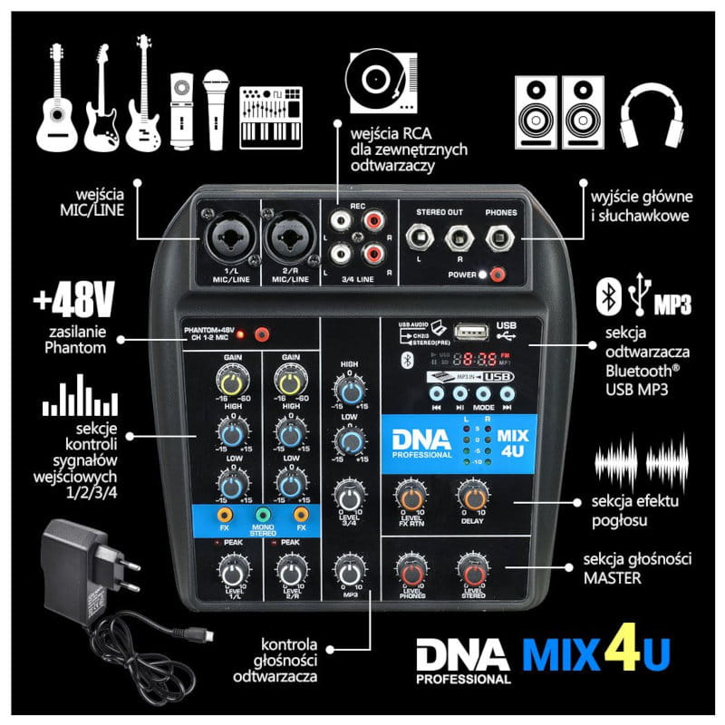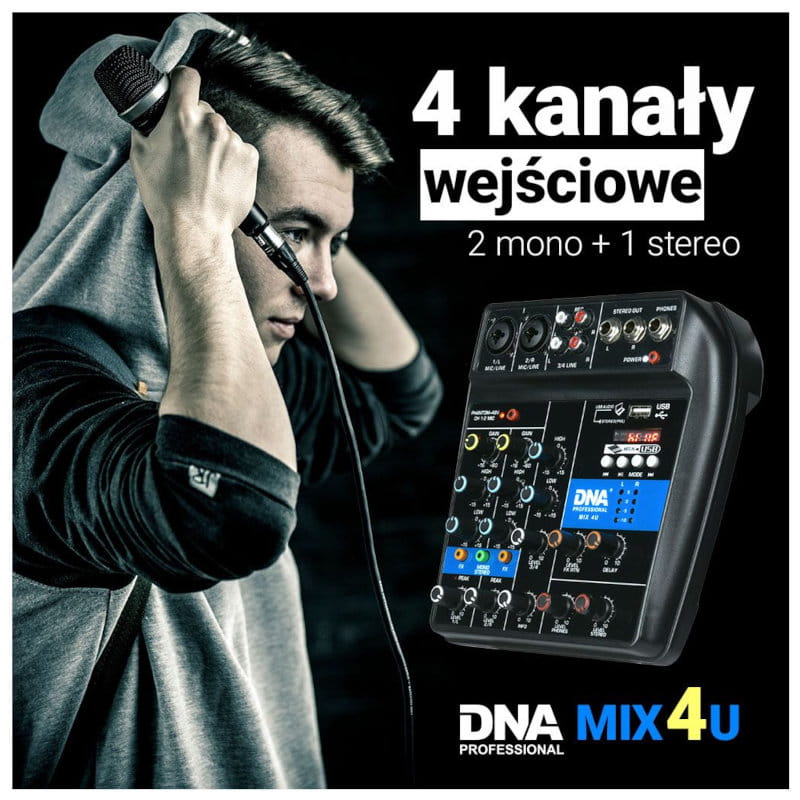 Dobry 4kanaowy mikser audio z USB, MP3 i BluetoothDNA MIX 4U to kompaktowy analogowy mikser dźwięki obsługujący standard bezprzewodowej komunikacji nbspBluetooth, wyposażony wnbspport USB inbspobsługę plikoewnbspMP3 oraz zasilanie Phantom 48V. Urządzenie obsługuje 4nbspkanały. Posiada 2nbspwejścia sygnałowe typu combo XLRjack, ktoere dzięki specjalnemu przełącznikowi mogą pracować wnbsptrybie mono lub jako jeden kanał stereo, oraz stereofoniczne złącze RCA cinch dla kanału 3 inbsp4. Użytkownik może kontrolować poziom głośności każdego znbspkanałoew, użyć 2pasmowego korektora tonoew wysokich inbspniskich, anbsptakże podbić sygnał na wejściach 1 inbsp2.nbsp Mikser dźwięku z efektamiMikser DNA MIX 4Unbspposiada wbudowany efekt opoeźnienia delay, ktoerego częstotliwość inbsppoziom nałożenia na dany kanał możemy wnbspłatwy sposoeb kontrolować. Sygnał wyjściowy może być podawany do głośnikoew lub monitorowany na słuchawkach. nbspNajmocniejszą stroną tego miksera dźwięku jest port USB znbspwbudowanym odtwarzaczem plikoew MP3, umożliwiający podłączenie do konsoli pendrive, laptopa, zewnętrznych kart pamięci lub innych urządzeń wysyłających sygnał audio.nbsp Mały mikser audio do roeżnych zastosowańAnalogowy mikser DNA MIX 4U to świetna propozycja dla wszystkich osoeb, ktoere interesuje niewielki, mobilny i konkurencyjny cenowo mikser audio. Urządzenie nbspdoskonale sprawdza się wnbspdomowym studio nagrań, podczas kameralnych koncertoew, anbsptakże jako rozwinięcie istniejących już instalacji nagłośnieniowych. Jeśli zastanawiasz się, jaki mikser audio wybrać, anbspnie potrzebujesz dużych, wielokanałowych inbspskomplikowanych wnbspobsłudze pulpitoew, to ta konsola mikserska, dostępna wnbspnajlepszej cenie od sklepu muzycznego Music Express, jest wnbspsam raz dla Ciebie!nbspSpecyfikacja techniczna Ilość kanałoew 4 2 mono 1 stereo Złącza XLRjack, RCA Głoewne wyjście stereo Wyjście AUX 2 wysyłanie efektu AUX Port USB typu A Obsługa danych Bluetooth 4.0, MP3 Zniekształcenie THDN le0,01 Pasmo przenoszenia 20 Hz 20 kHz Stosunek SN ge100dB Maks. poziom wyjściowy 28 dBu Zysk wejściowy mikrofon 35 dB 20 60 dB linia 20 dB 0 20 dB Korektor 2pasmowy HI, LOW Zasilanie DC 5V USB typu Micro B Wymiary 19 x 23,7 x 5,5 cm Waga 2 kg W zestawie zasilacz, instrukcja obsługiOryginalne opakowanie i wypełnienie.