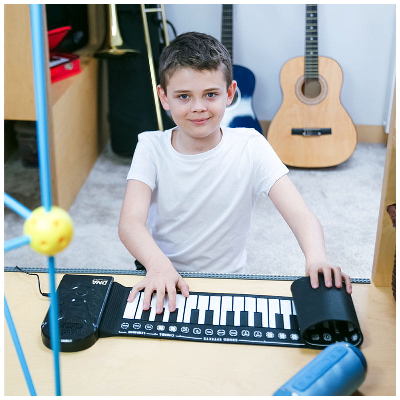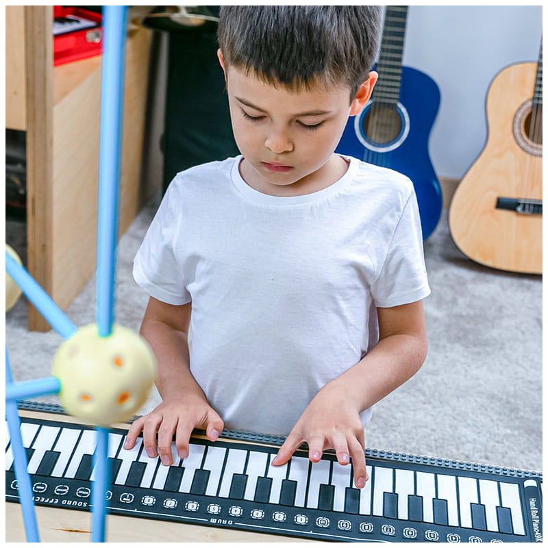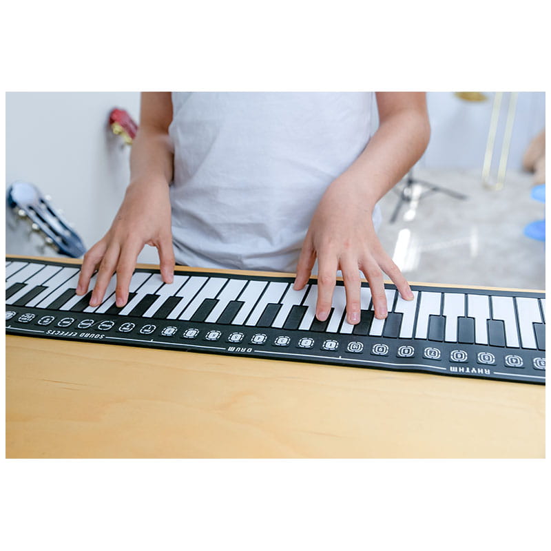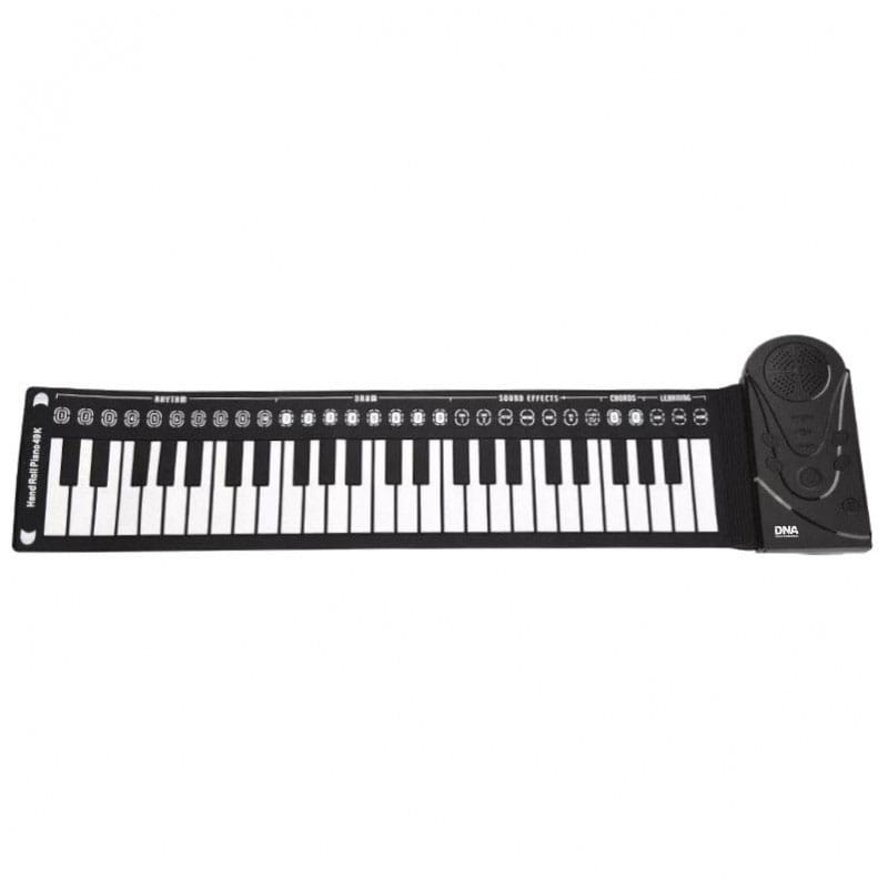 DNA ROLL 49 to innowacyjnie zaprojektowany, bezprzewodowy keyboard, ktoerego charakterystycznymi elementami s niewielki panel sterowania, zasilanie na 3 baterię AA 1.5V oraz zwijana klawiatura. Dzięki niewielkim rozmiarom inbspmałej wadze urządzenie jest bardzo mobilne, anbspzasilanie bateryjne pozwala korzystać znbsptego syntezatora dźwięku wnbspdowolnym miejscu.Zwijane pianino posiada 49 klawiszy 4 oktawy 1 klawisz. Wyposażone zostało wnbsp8 tryboew pracy perkusji, 16stopniową regulację głośności, 32stopniową regulację rytmu, 16 funkcji tonalnych, 10 opcji rytmu, 6 utworoew demo do nauki dla dzieci inbsppoczątkujących oraz tryb uśpienia oszczędzający energię. Panel sterowania umożliwia nagrywanie, anbsppoeźniej odtwarzanie zarejestrowanego materiału przy jednoczesnym dogrywaniu kolejnej partii instrumentalnej. Wbudowany, wnbsppełni regulowany głośnik pozwala na odsłuch dźwiękoew anbspzłączę 3,5 mm umożliwia nam podłączyć dowolne słuchawki bądź głośnik. Keyboard możemy zasilać bateryjnie anbsptakże za pomocą wbudowanego gniazda przez kabel USB dołączony do zestawu.DNA ROLL 49 to cyfrowy, zwijany keyboard, ktoery stanowi doskonałe narzędzie nauki inbspzabawy z dźwiękiem. Można go zabrać ze sobą na wakacje, używać wnbsppodroeży lub po prostu w domu. Rolowana klawiatura jest elastyczna, zajmuje mało miejsca, anbsppo rozwinięciu dopasowuje się do kształtu powierzchni, na ktoerej leży. To doskonałe, anbspjednocześnie stosunkowo tanie pianino cyfrowe w najlepszej cenie od sklepu muzycznego Music Express!nbspSpecyfikacja techniczna Klawiatura 49 klawiszy Materiał guma silikonowa klawiatura tworzywo ABS panel sterowania Demo 6 utworoew demonstracyjnych Kontrola głośności, tempa, rytmu Funkcje nagrywanie, odtwarzanie, Zasilanie DC 4,5V lub bateria AA 1,5Vnbspx 3 szt. baterie nie wchodzą w skład zestawu Port zasilania USB Kolornbsp czarny Gniazdo słuchawkowe Jack 3,5 mm Wymiary panelu sterowania 10,5 x 22,5 x 2,7 cm Wymiary klawiatury 73 x 17 x 0,3 cm Waga 632 g W zestawie keyboard, przewoed zasilający USB bez zasilacza, instrukcja obsługiOryginalne opakowanie i wypełnienie.